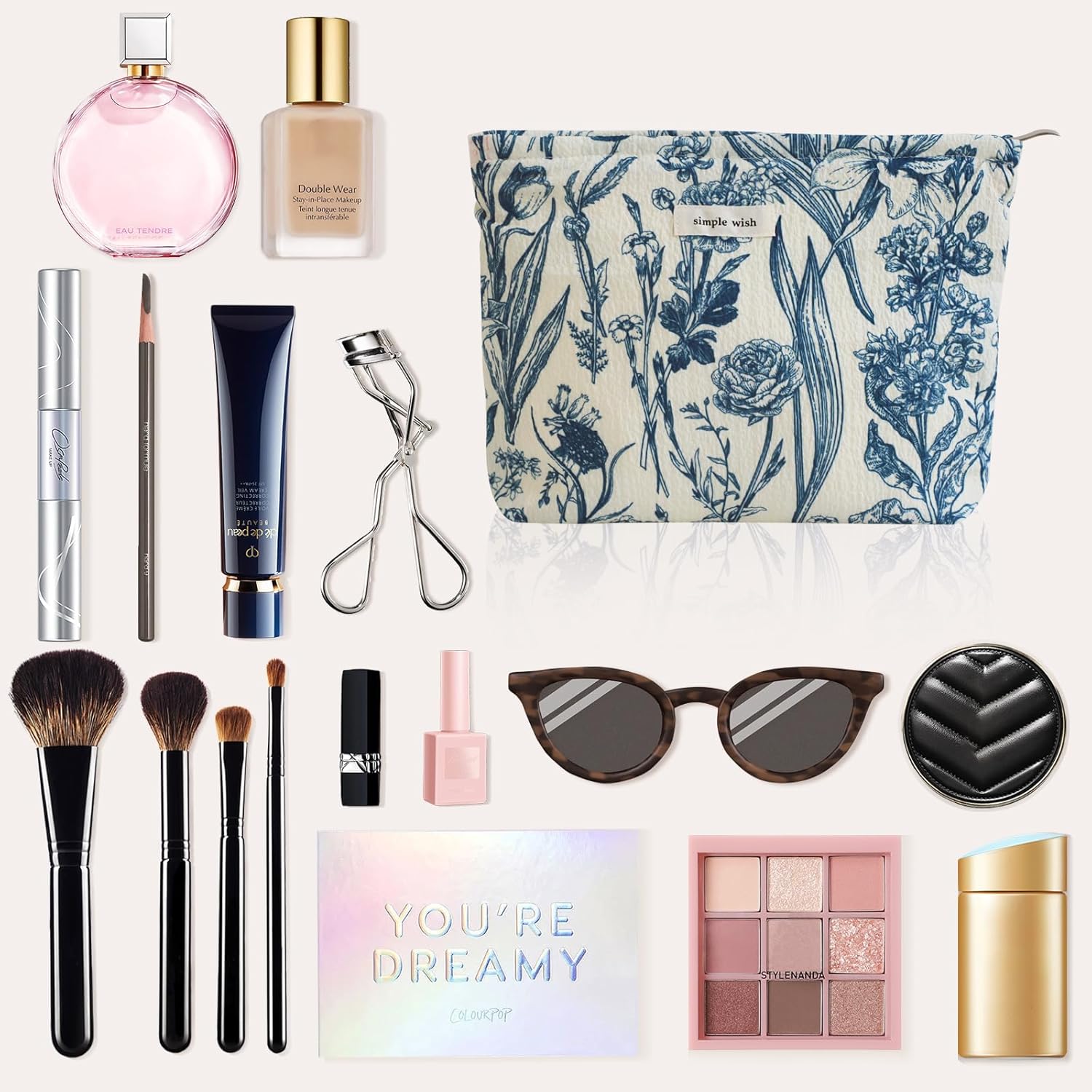 Wudygirl Cute Makeup Bag for Women - Travel Cosmetic Bag with Zipper Makeup Pouch Floral Make up Organizer Handbag Aesthetic (Porcelain Blue)