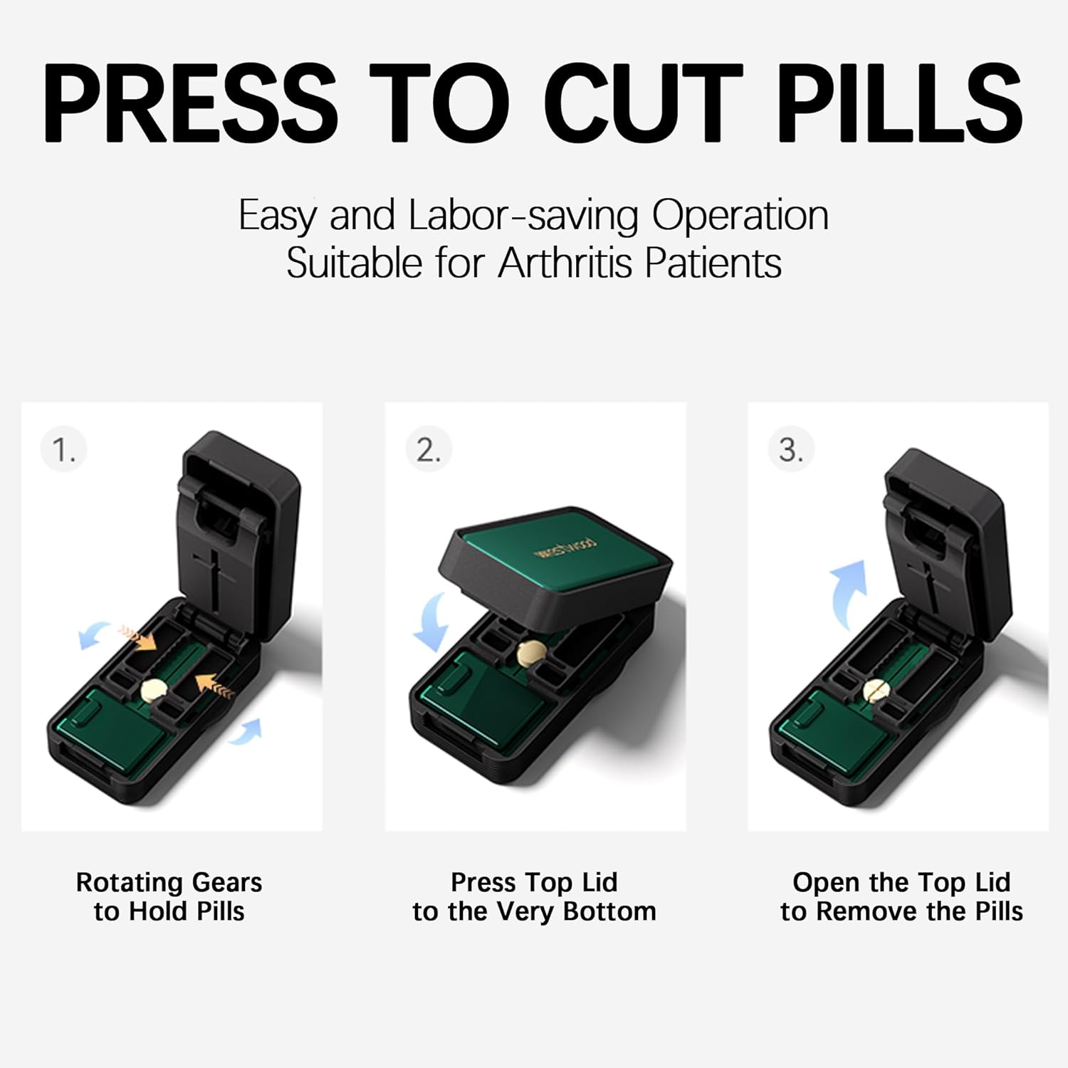 - 【Easy to Use】You just need to arrange the pills neatly on the pill cutter, make sure the pills are placed in the center, rotate the adjustable gear of the pill cutter to avoid the pills from sliding, and then press the lid to cut multiple pills into 1/2 or 1/4