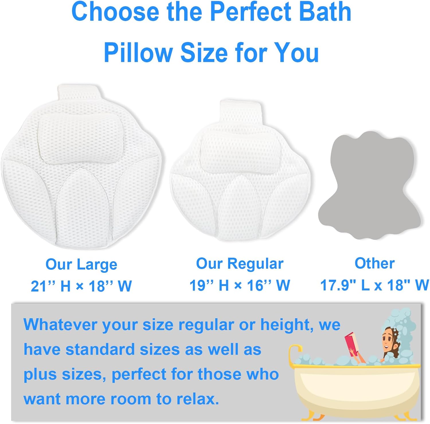 - Say Goodbye to One-Size-Fits-All Tub Pillows! We've got you covered with not one, but TWO perfect sizes. Keep it standard with our regular size (you know, like everyone else's), or go big with our extra-large version - perfect for taller folks or anyone who wants more room to relax. Whatever your body type or height, we've got the right fit to make your bath time way more comfy. Pick your perfect match and soak in style!
