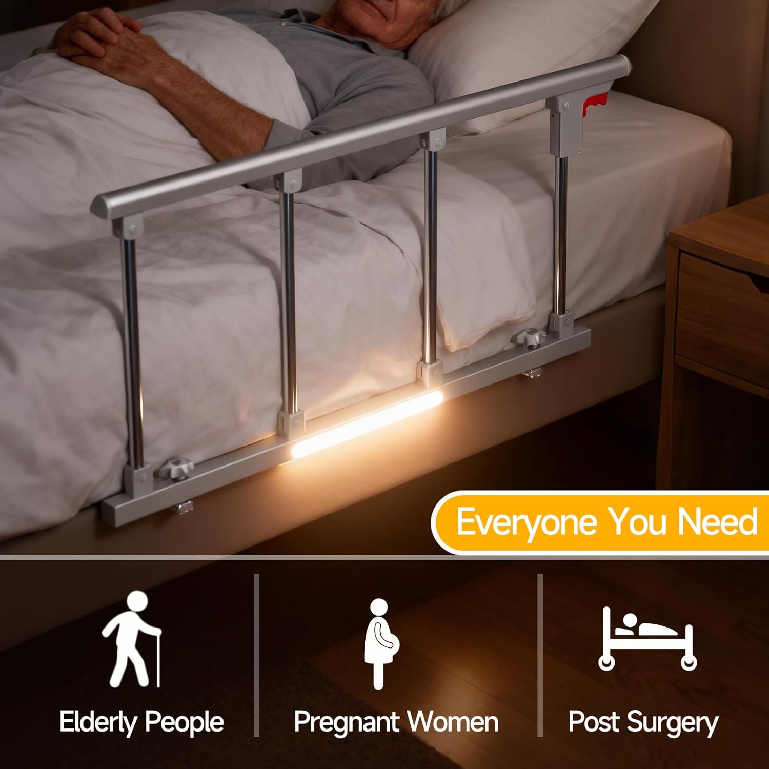 Bed Rails for Elderly Adults Safety, Folding Assist Handle with Motion Sensor Light, Fall Prevention Guard for Seniors & Surgery Patients, Fits Twin, Queen & King Beds, Tool-Free Assembly