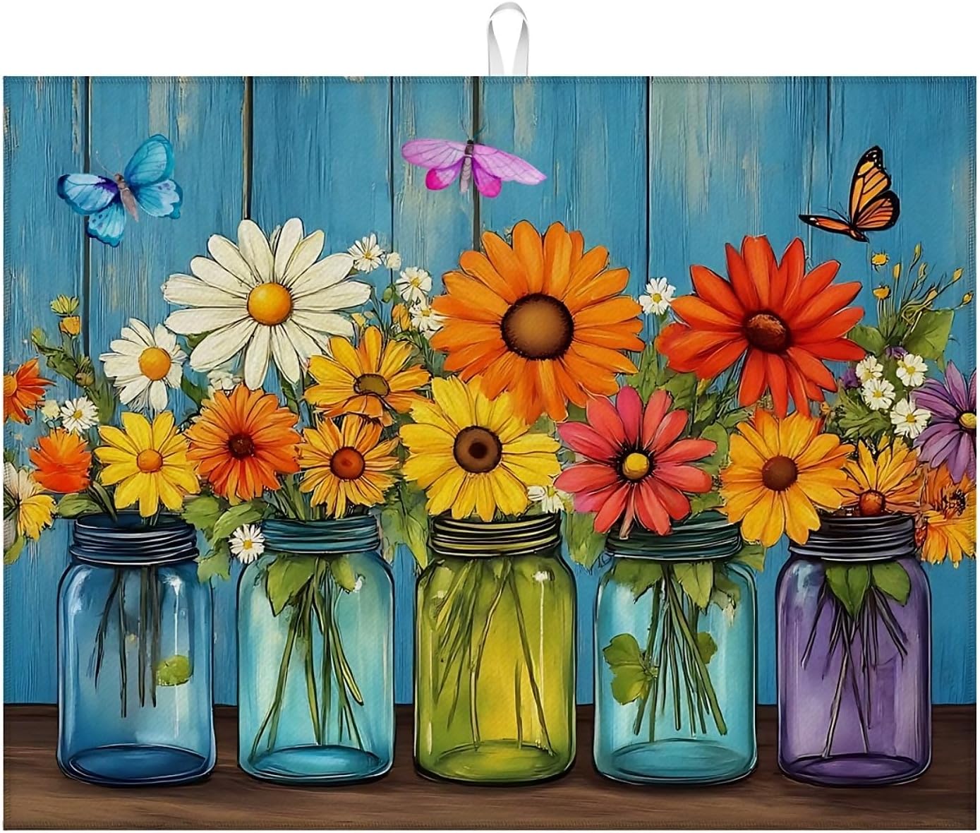Dish Drying Mat For Kitchen Counter, Vintage Daisy Flower Microfiber Absorbent Dish Drainer Rack Pad Reusable Large 18x24in Drying Mat
