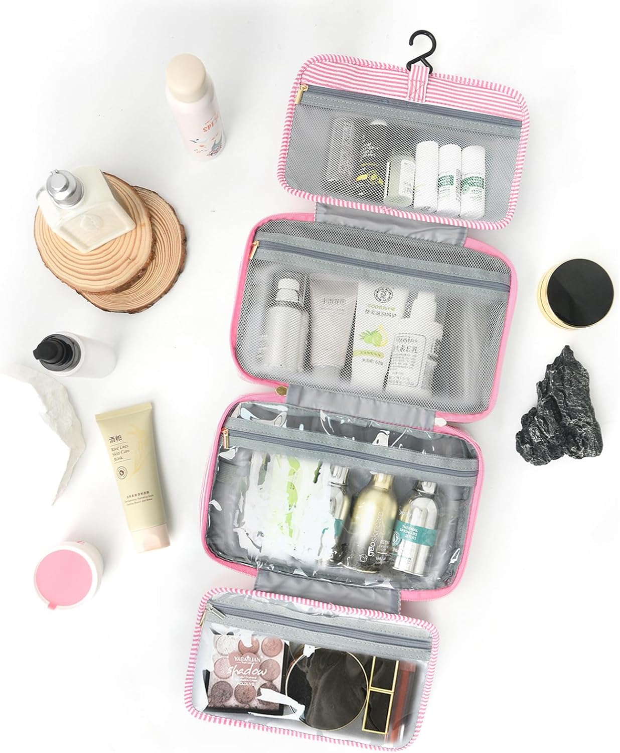 - UNIQUE DESIGN: The interior and exterior are designed with a user-friendly design, upgraded waterproofing, and transparent PVC for easy access. When unfolded, four independent compartments, separating wet and dry storage. Zippered, it provides secure storage and keeps toiletries, makeup, and accessories organized. The compartment design allows for easy viewing. An internal hanging hook makes it easy to hang and use. Multifunctional design makes it durable and practical