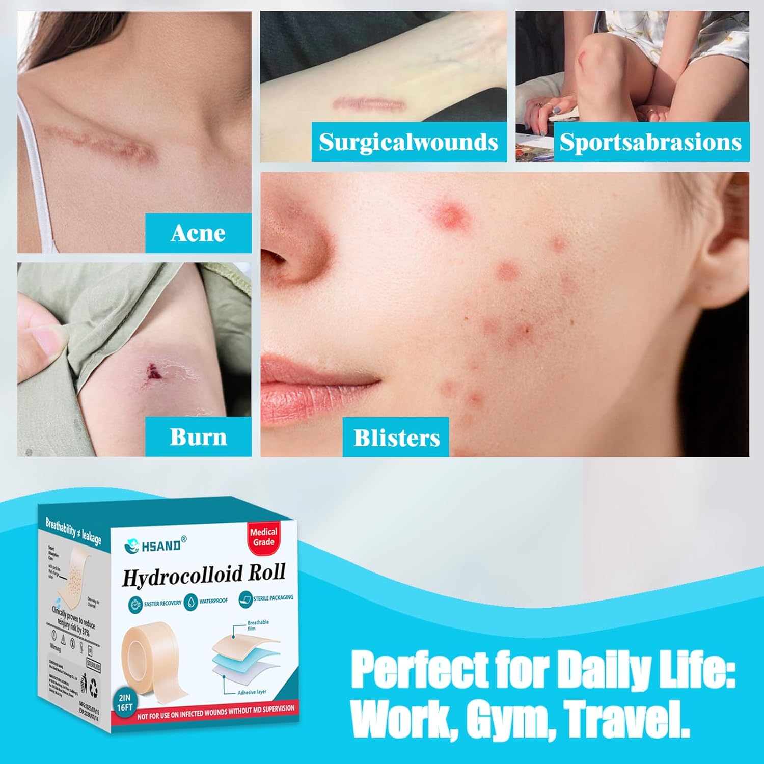 - 【Skin-Friendly & Waterproof Hydrocolloid Bandages】Hypoallergenic, latex-free medical grade hydrocolloid roll adheres securely even in water. Ultra-thin yet absorbs 3x more fluid than standard bandages, peels off painlessly without damaging new skin.